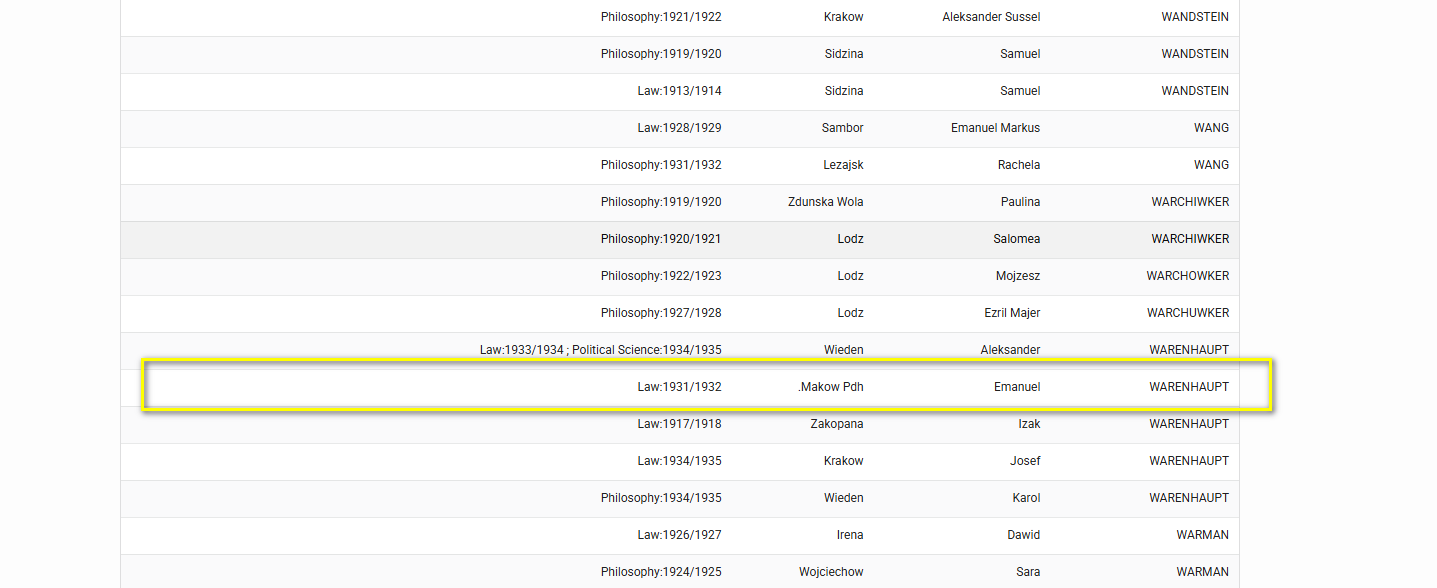 קטע ממסמך המתעד את רשימת הסטודנטים היהודים למשפטים באוניברסיטה היגלונית בין השנים 1910-1939
