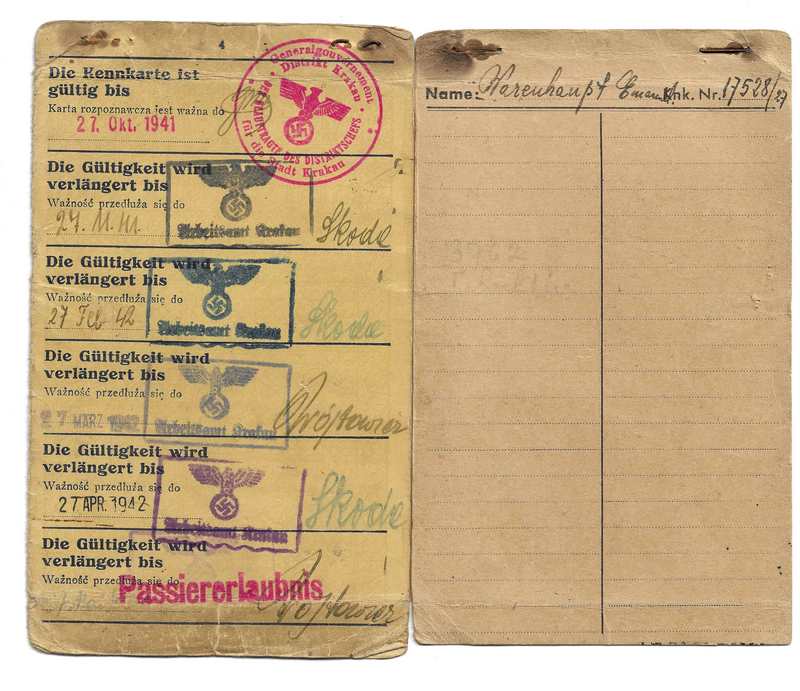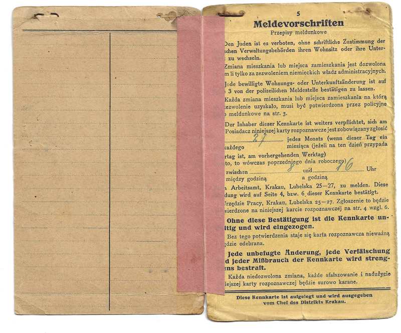 לאחר מספר חודשי הסתתרות אצל קליינוואקס, אבי נרשם באופן רשמי בגטו קרקוב וקיבל מהיודנראט כרטיס זיהוי מספר 17528/27, אותו היה מביא מדי חודש לחידוש ללשכת התעסוקה (Arbeitsamt) .